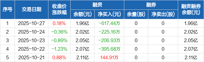 融资方面,当日融资买入824.74万元,融资偿还1442.18万元,融资净偿还617.44万元,连续4日净偿还累计1445.21万元。融券方面,融券卖出0股,融券偿还0股,融券余量0股,融券余额0元。融资融券余额合计1.96亿元。