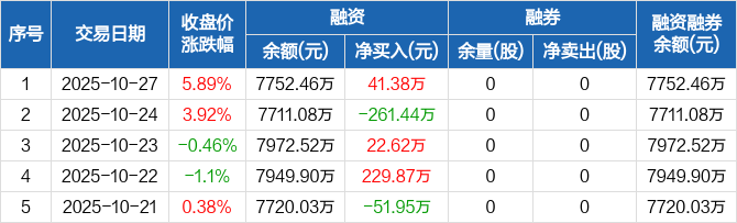 融资方面,当日融资买入694.46万元,融资偿还653.08万元,融资净买入41.38万元。融券方面,融券卖出0股,融券偿还0股,融券余量0股,融券余额0元。融资融券余额合计7752.46万元。