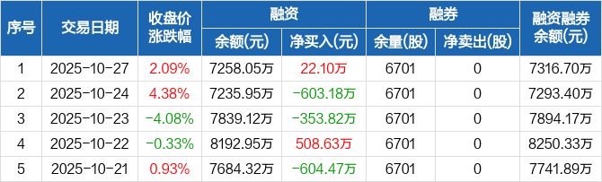 晶品特装:融资净买入22.1万元,融资余额7258.05万元(10-27)