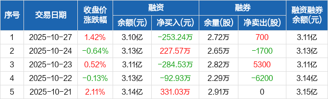 融资方面,当日融资买入1458.03万元,融资偿还1711.27万元,融资净偿还253.24万元。融券方面,融券卖出800股,融券偿还100股,融券余量2.72万股,融券余额21.35万元。融资融券余额合计3.11亿元。