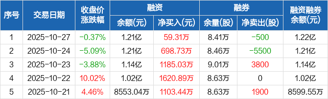 融资方面,当日融资买入2843.33万元,融资偿还2784.02万元,融资净买入59.31万元,连续7日净买入累计4899.63万元。融券方面,融券卖出0股,融券偿还500股,融券余量8.41万股,融券余额45.33万元。融资融券余额合计1.22亿元。