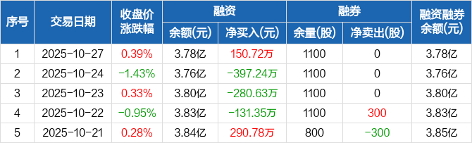 水井坊:融资净买入150.72万元,融资余额3.78亿元(10-27)