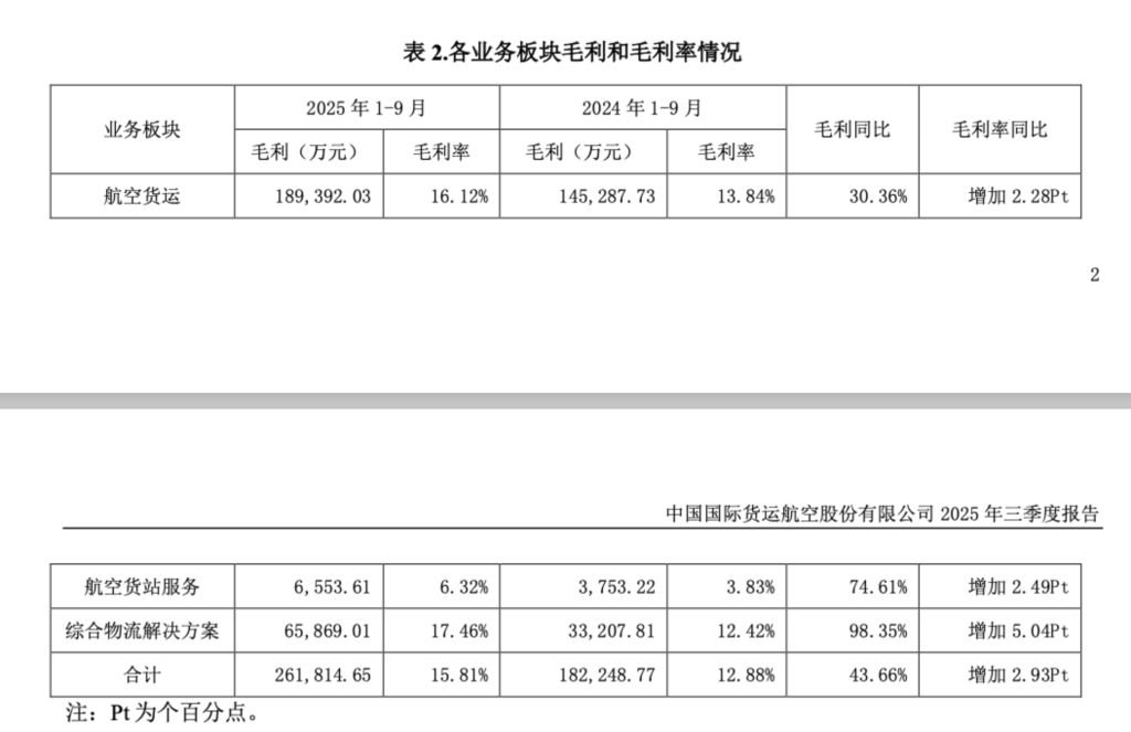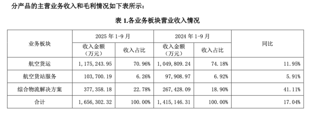 对于净利增长,财报指出,主要由于三季度公司货机机队规模相对2024年同期有明显增长,同时,公司航空货运服务、航空货站服务、综合物流解决方案三大业务板块均取得了较好的经营结果。