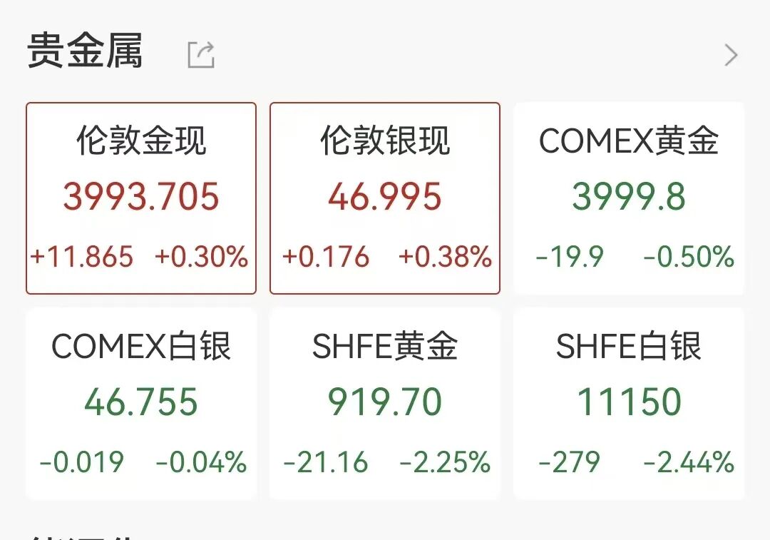 国际贵金属期货跌多涨少,现货黄金跌破4000美元/盎司,截至10月28日7:25,现货黄金涨0.3%报3993.705美元/盎司,COMEX黄金期货跌0.5%报3999.8美元/盎司。