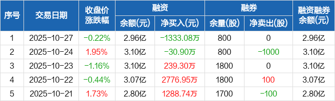 融资方面,当日融资买入3055.25万元,融资偿还4388.33万元,融资净偿还1333.08万元。融券方面,融券卖出0股,融券偿还0股,融券余量800股,融券余额1.46万元。融资融券余额合计2.96亿元。
