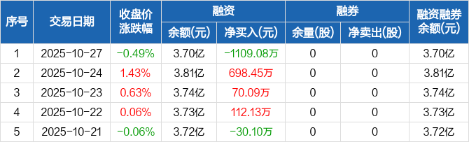 融资方面,当日融资买入3009.3万元,融资偿还4118.38万元,融资净偿还1109.08万元。融券方面,融券卖出0股,融券偿还0股,融券余量0股,融券余额0元。融资融券余额合计3.7亿元。