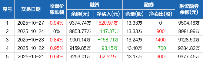 九阳股份:融资净买入520.97万元,融资余额9374.74万元(10-27)