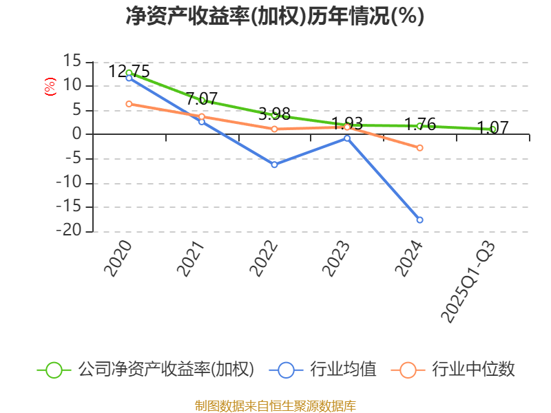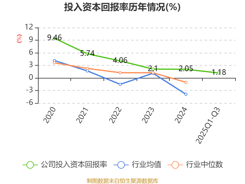 盈利能力方面, 2025年前三季度公司加权平均净资产收益率为1.07%,同比下降2.63个百分点。公司2025年前三季度投入资本回报率为1.18%,较上年同期下降2.18个百分点。