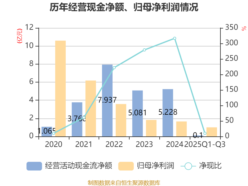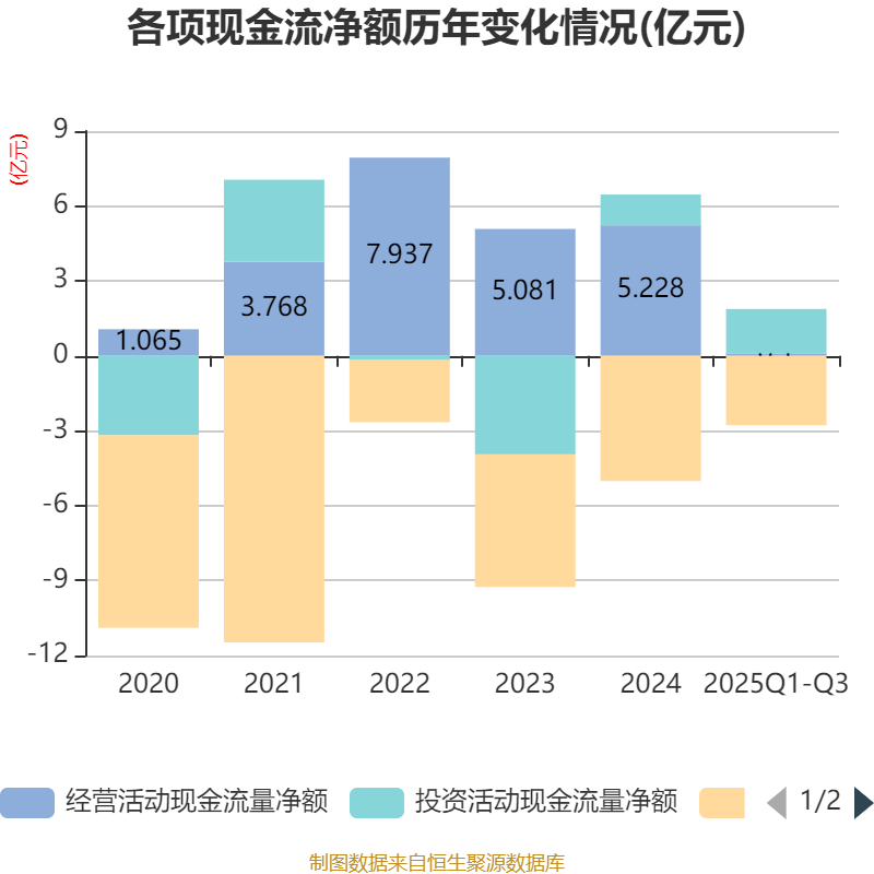 2025年前三季度,公司经营活动现金流净额为995.61万元,同比下降90.43%;筹资活动现金流净额-2.78亿元,同比减少351.28万元;投资活动现金流净额1.77亿元,上年同期为1.47亿元。