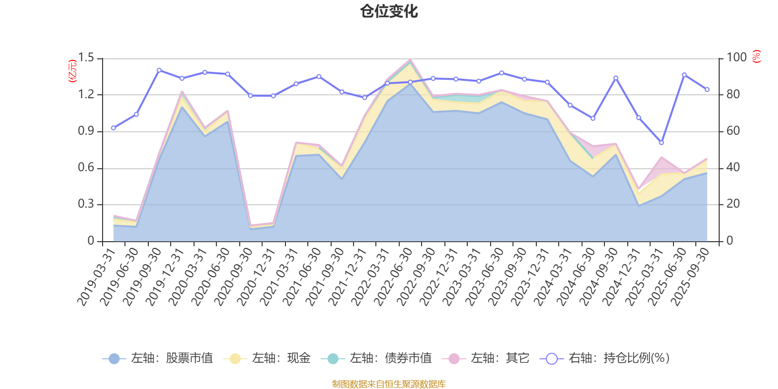 据定期报告数据统计,近三年平均股票仓位为80.86%,同类平均为72.16%。2019年三季度末基金达到93.52%的最高仓位,2025年一季度末最低,为53.97%。