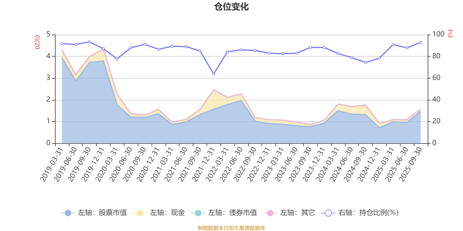 据定期报告数据统计,近三年平均股票仓位为84.23%,同类平均为72.17%。2019年三季度末基金达到93.33%的最高仓位,2021年末最低,为63.86%。