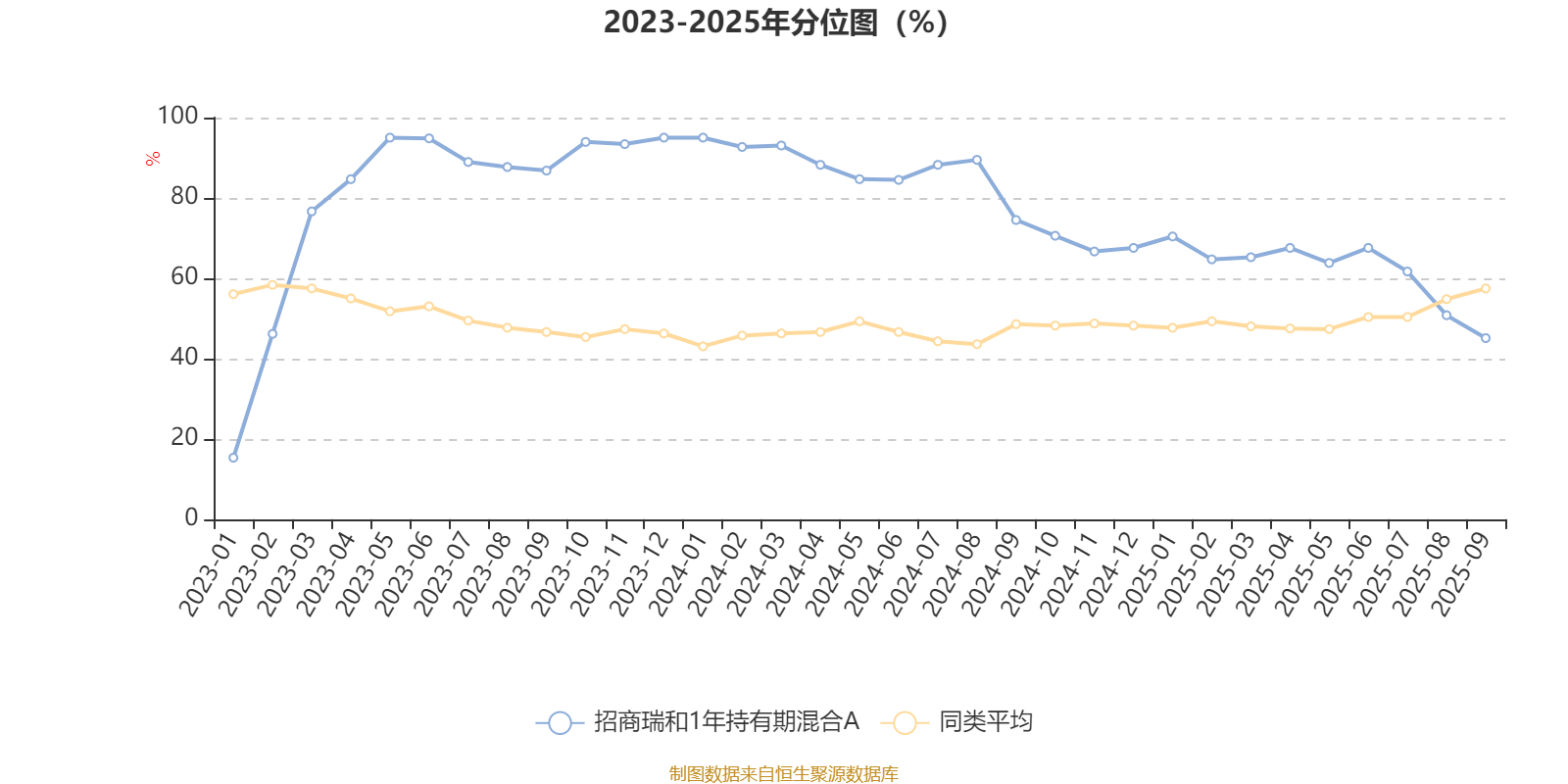通过所选区间该基金净值增长率分位图,可以观察该基金与同类基金业绩比较情况。图为坐标原点到区间内某时点的净值增长率在同类基金中的分位数。