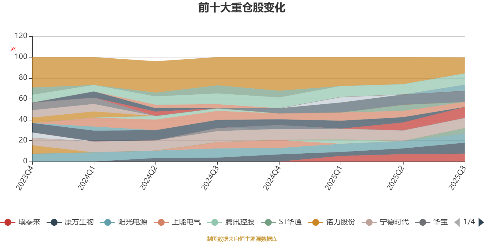该基金持股集中度较高,近2年前十大重仓股集中度长期超过60%。截至2025年三季度末,基金十大重仓股分别是小鹏汽车-W、吉利汽车、苑东生物、康方生物、宁德时代、阳光电源、璞泰来、上海洗霸、ST华通、德业股份。