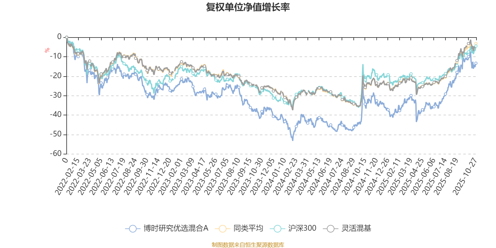 截至10月27日,博时研究优选混合A近三个月复权单位净值增长率为14.89%,位于同类可比基金531/1287;近半年复权单位净值增长率为38.16%,位于同类可比基金310/1287;近一年复权单位净值增长率为26.80%,位于同类可比基金526/1287;近三年复权单位净值增长率为23.92%,位于同类可比基金449/1286。
