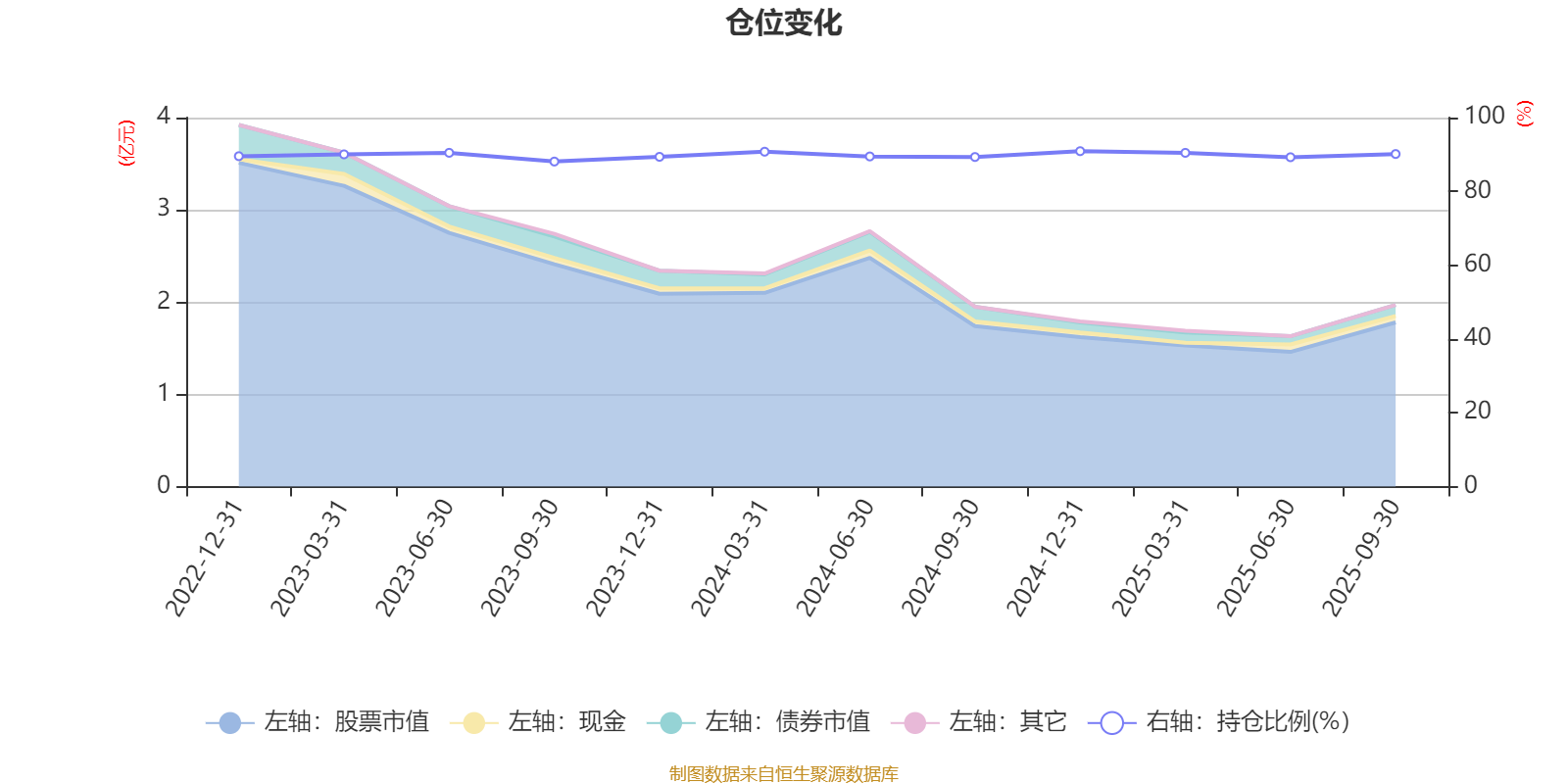 据定期报告数据统计,近三年平均股票仓位为89.82%,同类平均为85.51%。2024年末基金达到90.9%的最高仓位,2023年三季度末最低,为88.09%。