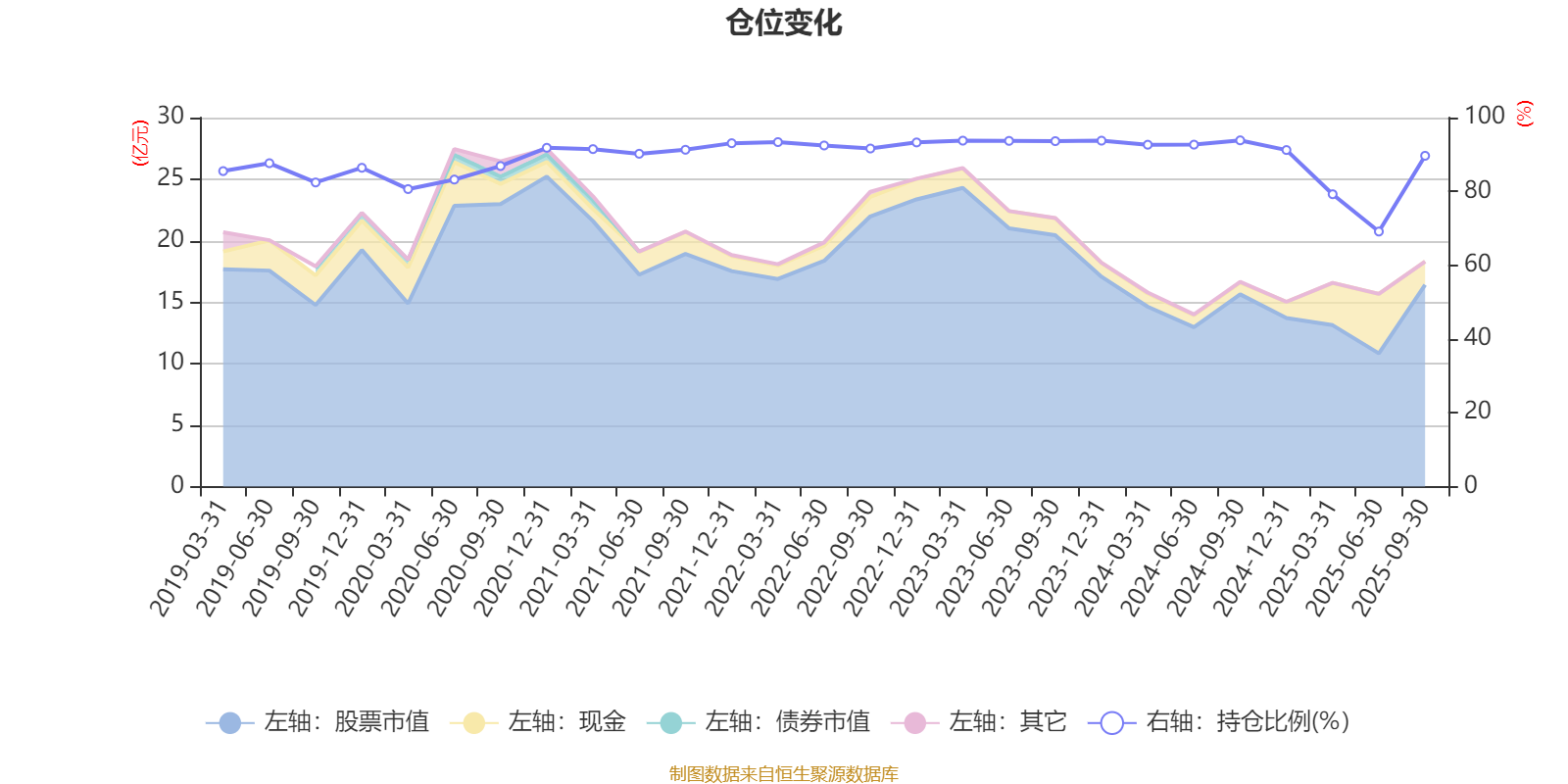 据定期报告数据统计,近三年平均股票仓位为89.7%,同类平均为87.55%。2024年三季度末基金达到93.84%的最高仓位,2025年上半年末最低,为69.12%。