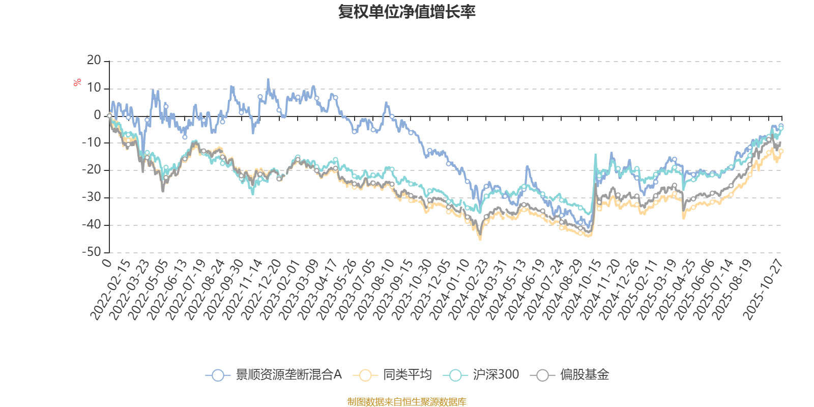 截至10月27日,景顺资源垄断混合A近三个月复权单位净值增长率为11.00%,位于同类可比基金130/185;近半年复权单位净值增长率为22.71%,位于同类可比基金128/185;近一年复权单位净值增长率为22.99%,位于同类可比基金111/181;近三年复权单位净值增长率为-3.78%,位于同类可比基金151/175。