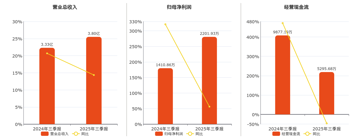 公司营业总收入为3.80亿元,在已披露的同业公司中排名第2。归母净利润为2201.93万元。经营活动现金净流入为5295.68万元,较去年同报告期经营活动现金净流入减少4581.52万元,同比较去年同期下降46.38%。