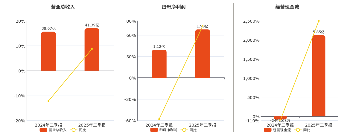公司营业总收入为41.39亿元。归母净利润为1.93亿元。经营活动现金净流入为5.85亿元。