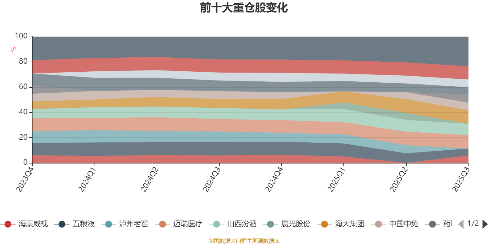 该基金持股集中度较高,且持股标的较为稳定,近2年前十大重仓股集中度长期超过60%。截至2025年三季度末,基金十大重仓股分别是迈瑞医疗、海大集团、贵州茅台、山西汾酒、药明康德、美的集团、中国中免、海康威视、古井贡酒、五粮液。