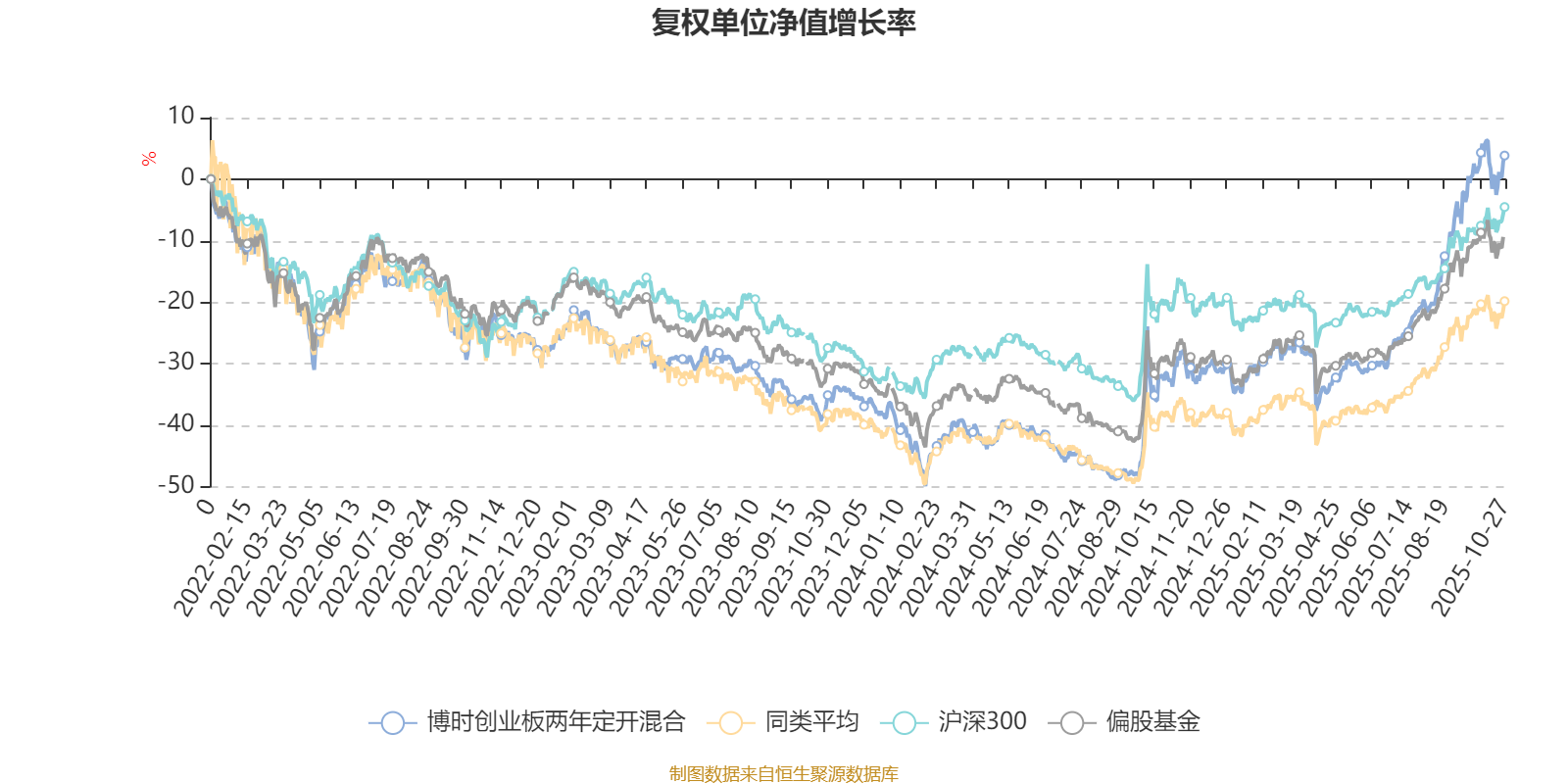 截至10月27日,博时创业板两年定开混合近三个月复权单位净值增长率为31.28%,位于同类可比基金73/621;近半年复权单位净值增长率为53.27%,位于同类可比基金66/619;近一年复权单位净值增长率为51.64%,位于同类可比基金105/611;近三年复权单位净值增长率为38.37%,位于同类可比基金117/518。
