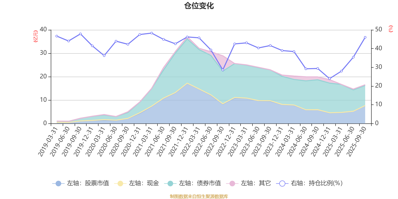 据定期报告数据统计,近三年平均股票仓位为36.4%,同类平均为19.02%。2021年一季度末基金达到48.28%的最高仓位,2024年末最低,为23.95%。