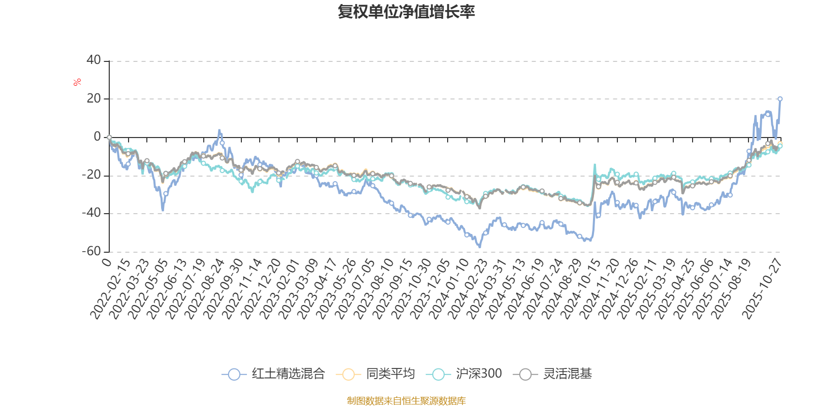 截至10月27日,红土精选混合近三个月复权单位净值增长率为57.85%,位于同类可比基金22/1287;近半年复权单位净值增长率为90.24%,位于同类可比基金31/1287;近一年复权单位净值增长率为80.24%,位于同类可比基金40/1287;近三年复权单位净值增长率为38.07%,位于同类可比基金238/1286。