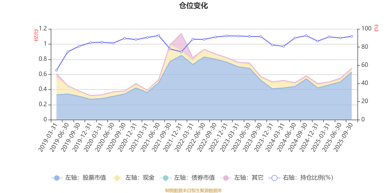 据定期报告数据统计,近三年平均股票仓位为89.5%,同类平均为72.17%。2021年上半年末基金达到92.74%的最高仓位,2019年一季度末最低,为54.49%。