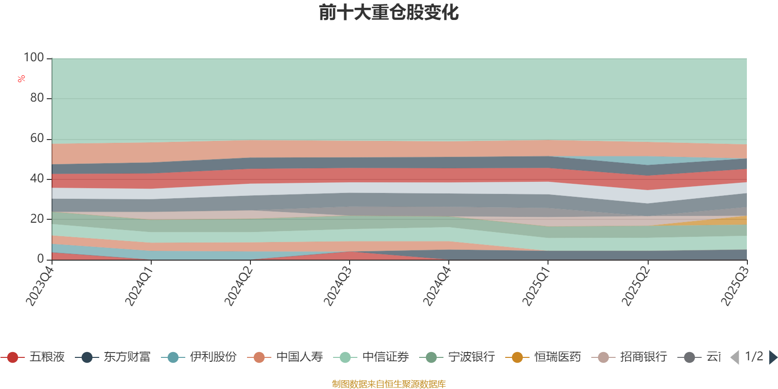 该基金持股集中度较高,且持股标的较为稳定。截至2025年三季度末,基金十大重仓股分别是贵州茅台、新和成、中信证券、平安银行、宁波银行、兴业银行、美的集团、东方财富、恒瑞医药、云南白药。