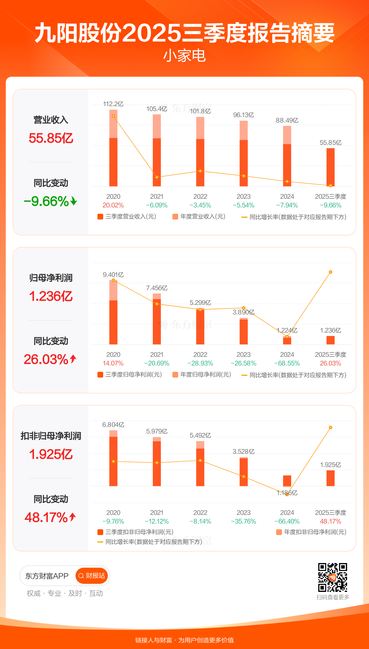九阳股份10月28日发布2025年三季报显示,公司前三季实现营业收入55.85亿元,同比下滑9.66%;归母净利润1.24亿元,同比增长26.03%;扣非归母净利润1.92亿元,同比增长48.17%。