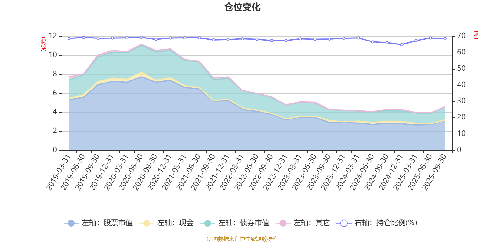 据定期报告数据统计,近三年平均股票仓位为67.73%,同类平均为67.17%。2020年上半年末基金达到69.35%的最高仓位,2024年末最低,为64.88%。