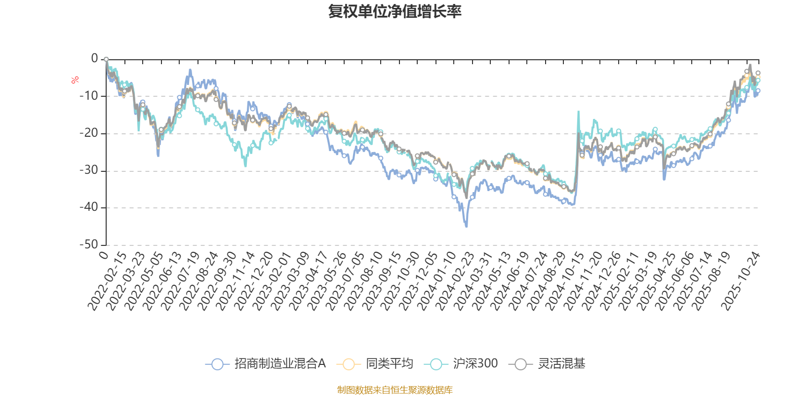 截至10月24日,招商制造业混合A近三个月复权单位净值增长率为15.37%,位于同类可比基金478/1287;近半年复权单位净值增长率为27.39%,位于同类可比基金511/1287;近一年复权单位净值增长率为21.75%,位于同类可比基金634/1287;近三年复权单位净值增长率为9.31%,位于同类可比基金761/1286。