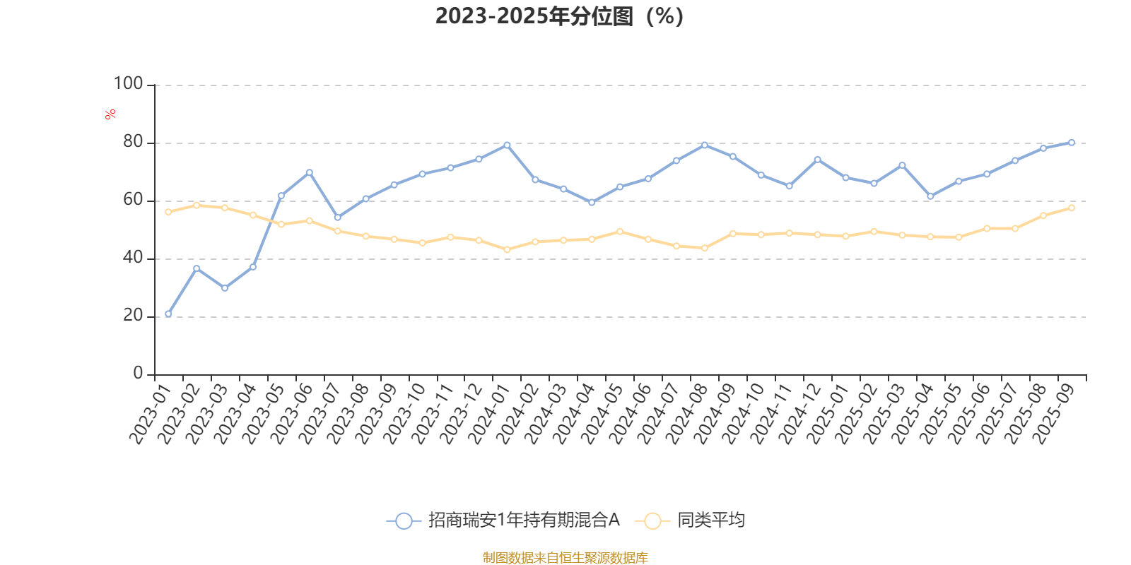 通过所选区间该基金净值增长率分位图,可以观察该基金与同类基金业绩比较情况。图为坐标原点到区间内某时点的净值增长率在同类基金中的分位数。