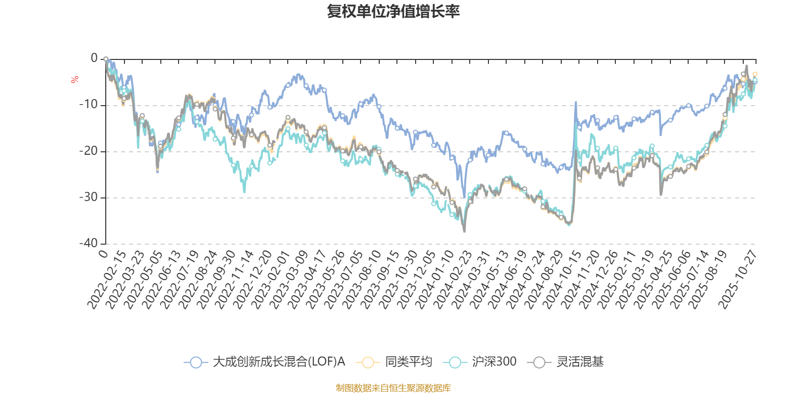 截至10月27日,大成创新成长混合(LOF)A近三个月复权单位净值增长率为2.79%,位于同类可比基金1057/1287;近半年复权单位净值增长率为9.58%,位于同类可比基金1039/1287;近一年复权单位净值增长率为9.79%,位于同类可比基金971/1287;近三年复权单位净值增长率为11.70%,位于同类可比基金733/1286。