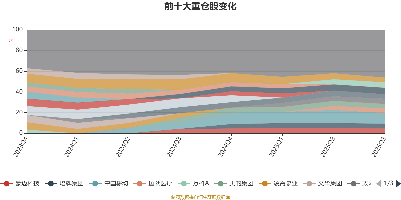 该基金持股集中度较高。截至2025年三季度末,基金十大重仓股分别是中国移动、安琪酵母、温氏股份、太阳纸业、豪迈科技、塔牌集团、确成股份、鱼跃医疗、美的集团、格力电器。