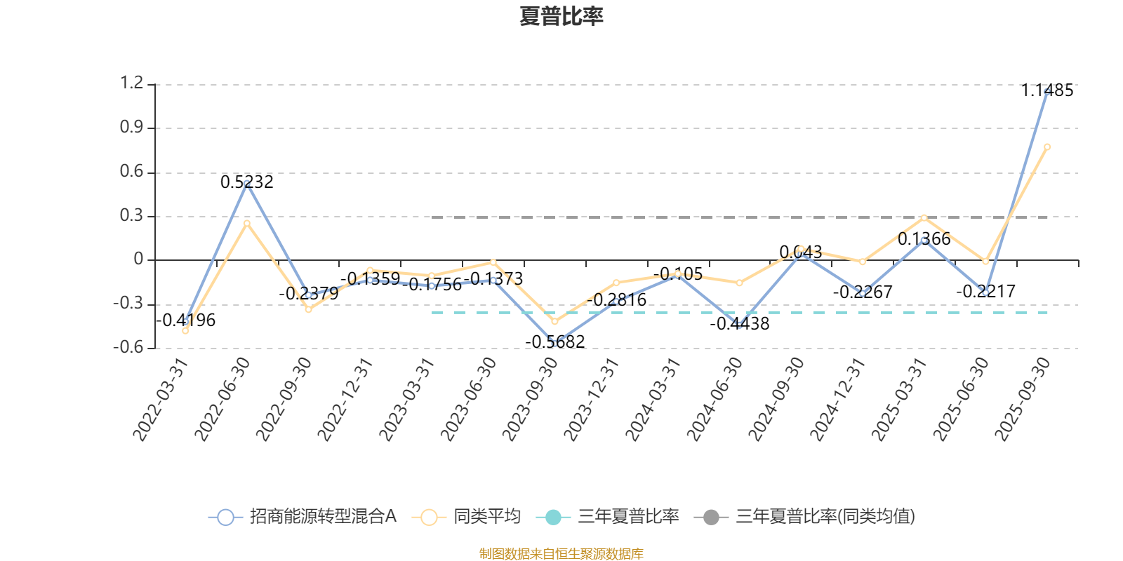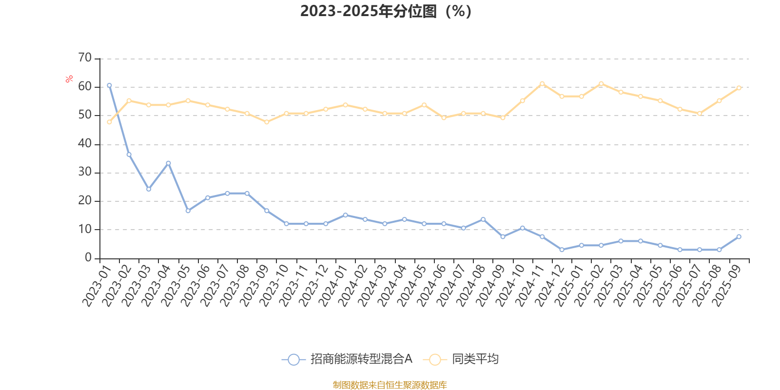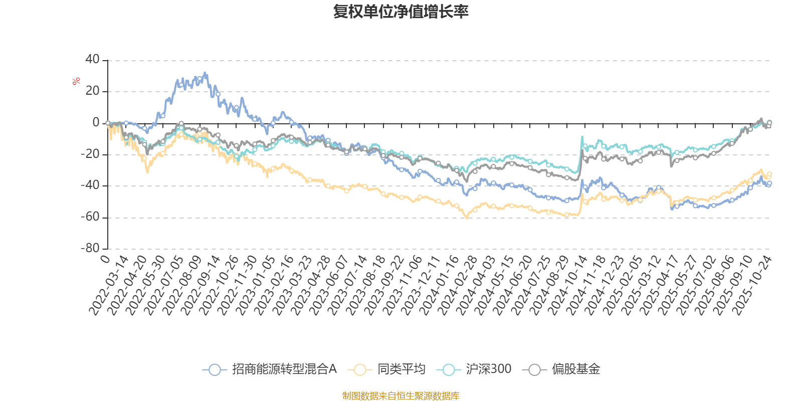 截至10月24日,招商能源转型混合A近三个月复权单位净值增长率为21.54%,位于同类可比基金46/100;近半年复权单位净值增长率为27.85%,位于同类可比基金58/99;近一年复权单位净值增长率为3.15%,位于同类可比基金83/90;近三年复权单位净值增长率为-42.02%,位于同类可比基金59/62。