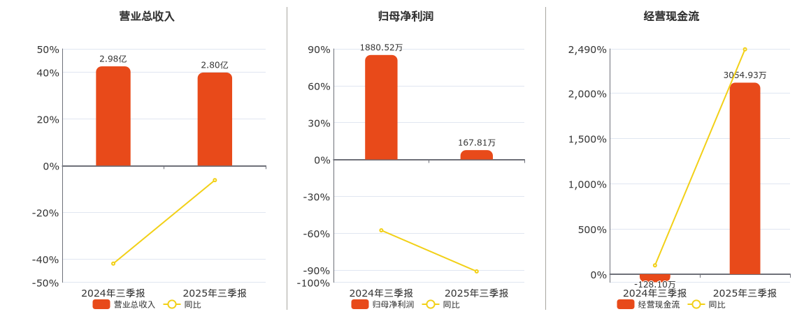 公司营业总收入为2.80亿元,较去年同报告期营业总收入减少1858.17万元,同比较去年同期下降6.23%。归母净利润为167.81万元,较去年同报告期归母净利润减少1712.71万元,同比较去年同期下降91.08%。经营活动现金净流入为3054.93万元,较去年同报告期经营活动现金净流入增加3183.03万元,实现2年连续上涨。