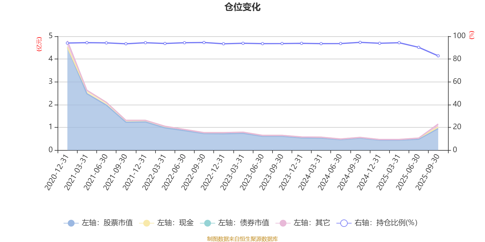 据定期报告数据统计,近三年平均股票仓位为92.63%,同类平均为72.16%。2024年三季度末基金达到94.66%的最高仓位,2025年三季度末最低,为82.85%。