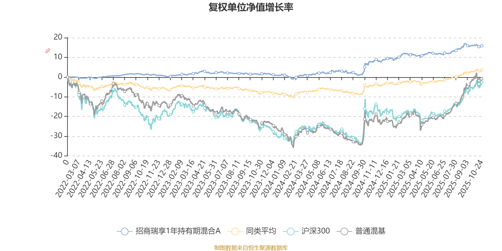 截至10月24日,招商瑞享1年持有期混合A近三个月复权单位净值增长率为2.30%,位于同类可比基金308/629;近半年复权单位净值增长率为3.78%,位于同类可比基金427/629;近一年复权单位净值增长率为7.55%,位于同类可比基金260/623;近三年复权单位净值增长率为14.32%,位于同类可比基金175/556。