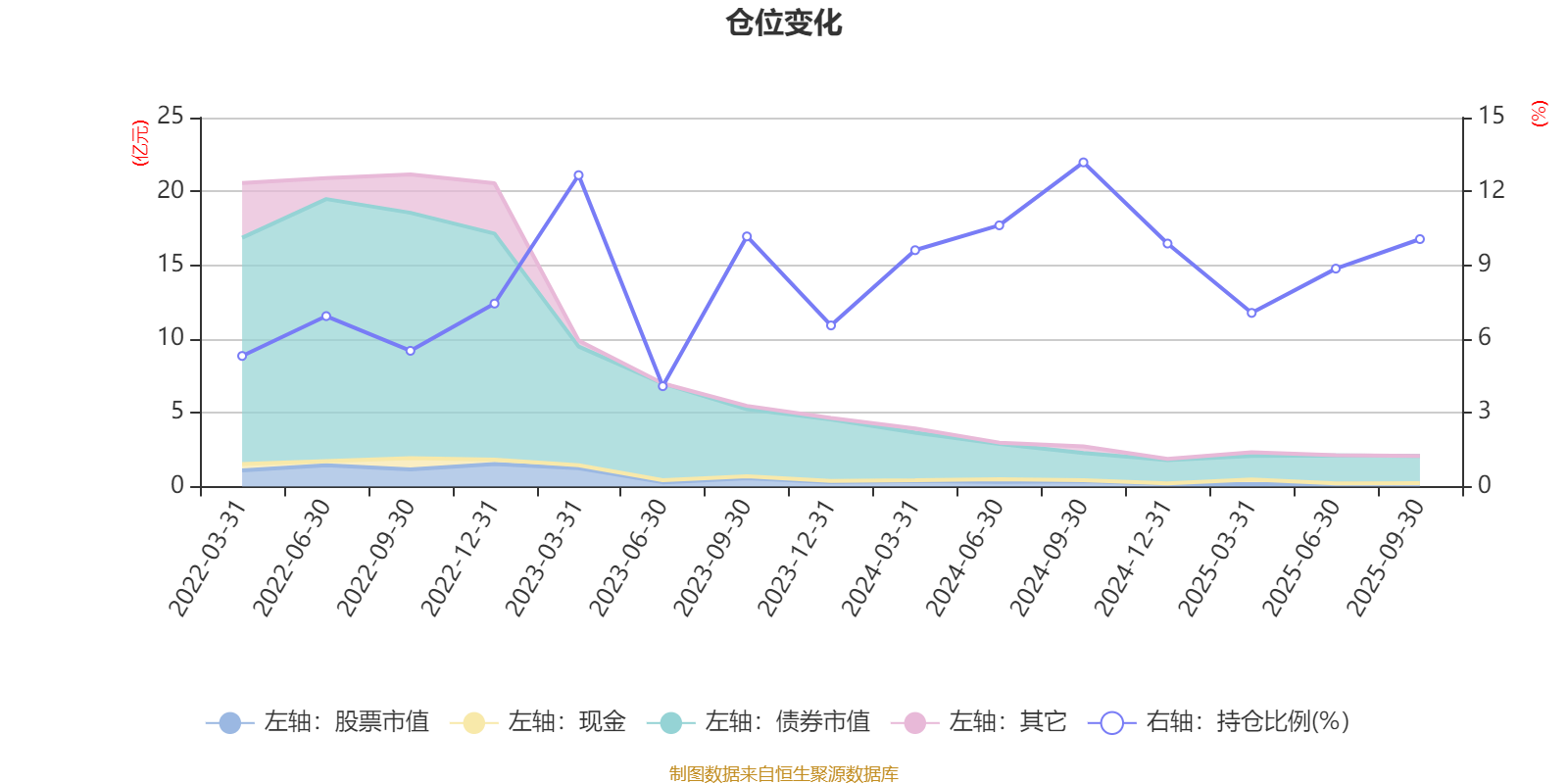 据定期报告数据统计,近三年平均股票仓位为9.18%,同类平均为19.03%。2024年三季度末基金达到13.18%的最高仓位,2023年上半年末最低,为4.08%。