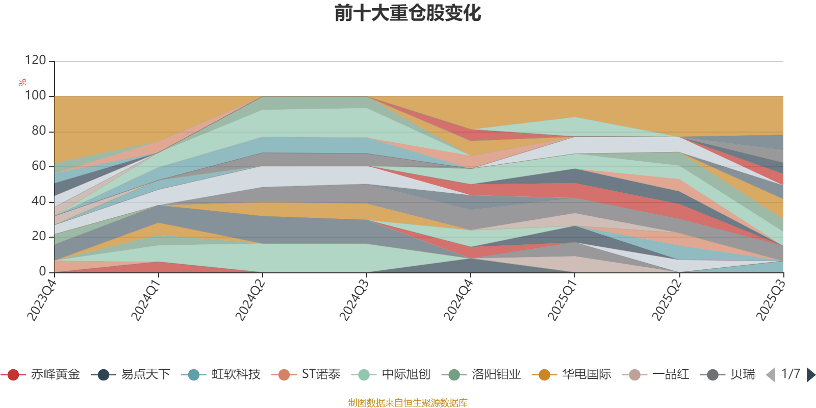 该基金持股集中度较高,近2年前十大重仓股集中度长期超过60%。截至2025年三季度末,基金十大重仓股分别是能科科技、昆仑万维、寒武纪、中芯国际、国能日新、中旗新材、广立微、高新发展、豆神教育、虹软科技。