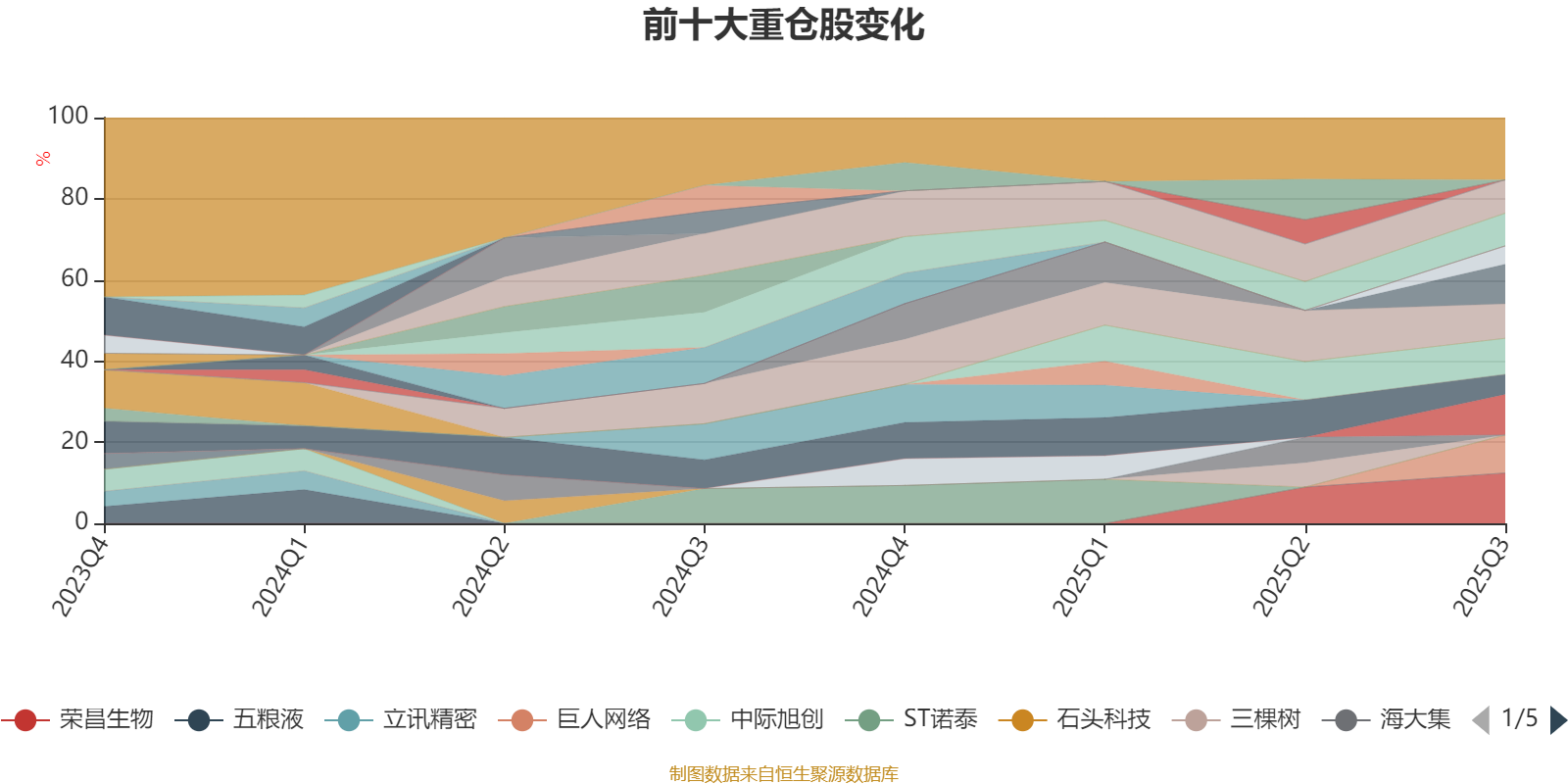 该基金持股集中度较高。截至2025年三季度末,基金十大重仓股分别是荣昌生物、ST华通、吉比特、巨人网络、百济神州、匠心家居、嘉益股份、神农集团、贵州茅台、海尔智家。