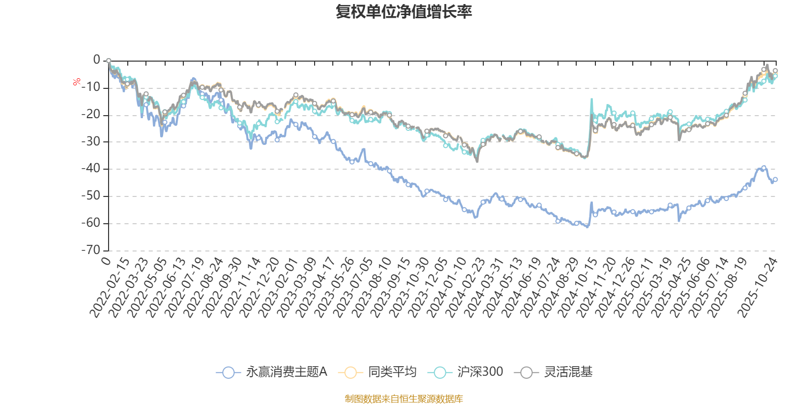 截至10月24日,永赢消费主题A近三个月复权单位净值增长率为11.12%,位于同类可比基金649/1287;近半年复权单位净值增长率为23.35%,位于同类可比基金625/1287;近一年复权单位净值增长率为25.52%,位于同类可比基金541/1287;近三年复权单位净值增长率为-20.60%,位于同类可比基金1217/1286。
