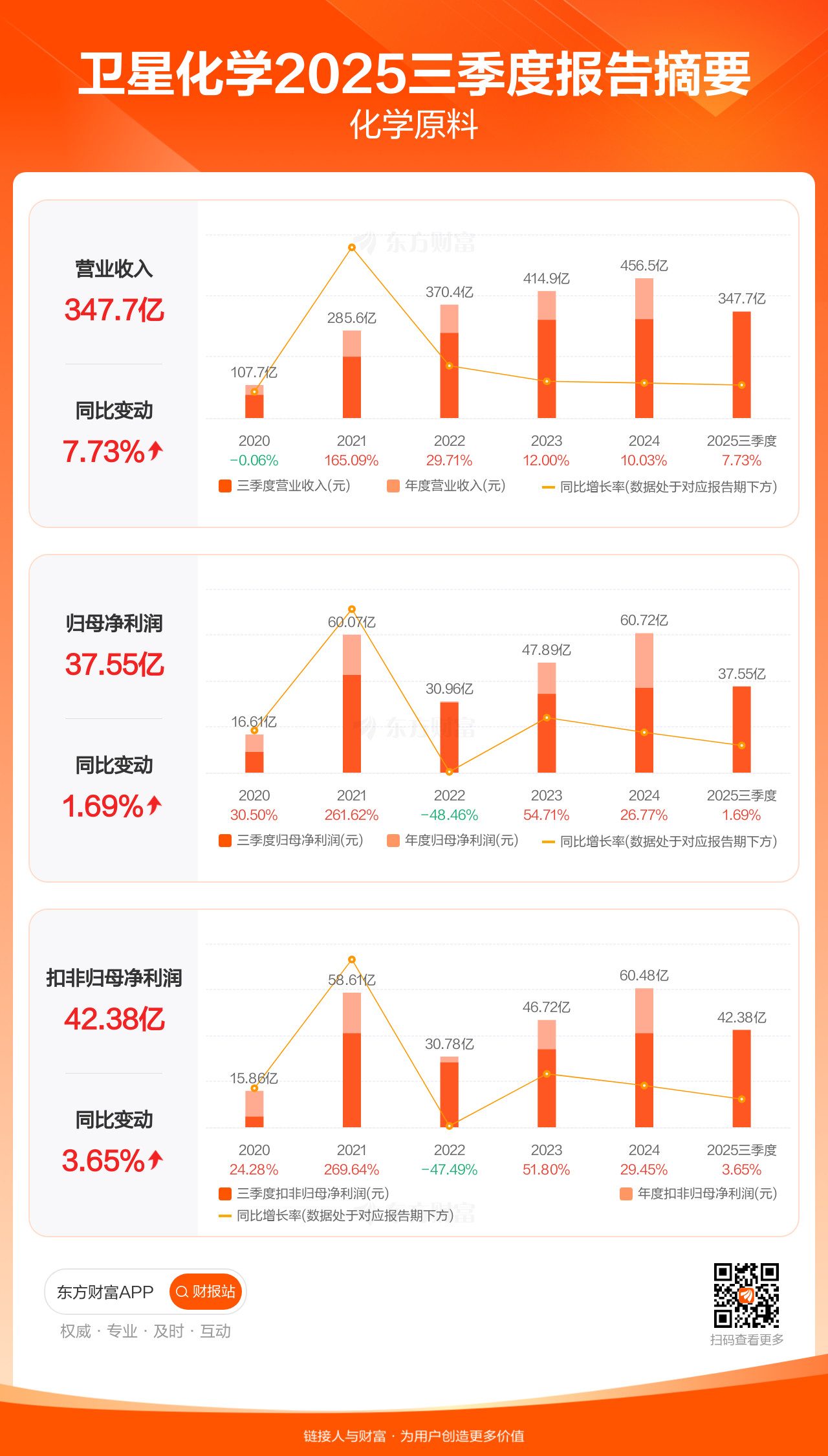 卫星化学10月25日发布2025年三季报显示,公司前三季实现营业收入347.71亿元,同比增长7.73%;归母净利润37.55亿元,同比增长1.69%;扣非归母净利润42.38亿元,同比增长3.65%。