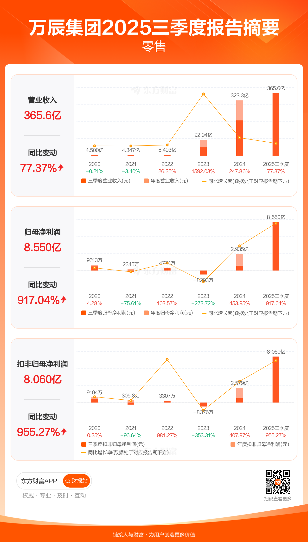 万辰集团10月22日发布2025年三季报显示,公司前三季实现营业收入365.62亿元,同比增长77.37%;归母净利润8.55亿元,同比增长917.04%;扣非归母净利润8.06亿元,同比增长955.27%。