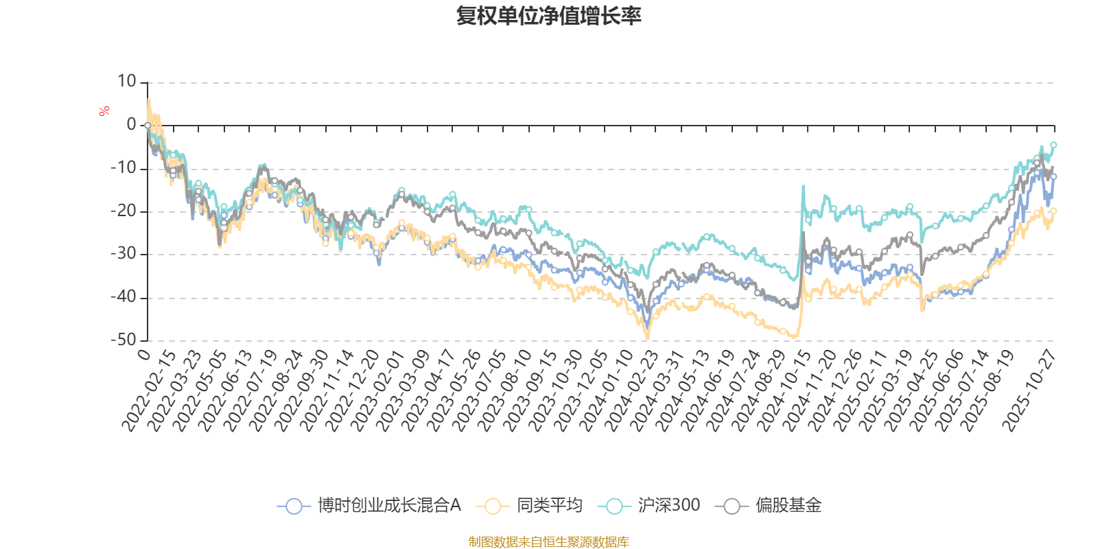截至10月27日,博时创业成长混合A近三个月复权单位净值增长率为26.82%,位于同类可比基金127/621;近半年复权单位净值增长率为45.55%,位于同类可比基金107/619;近一年复权单位净值增长率为27.00%,位于同类可比基金333/611;近三年复权单位净值增长率为15.04%,位于同类可比基金264/518。