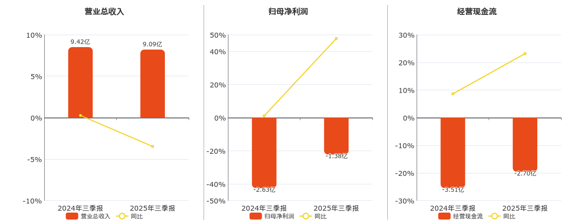 公司营业总收入为9.09亿元,较去年同报告期营业总收入减少3277.50万元,同比较去年同期下降3.48%。归母净利润为-1.38亿元。经营活动现金净流入为-2.70亿元。