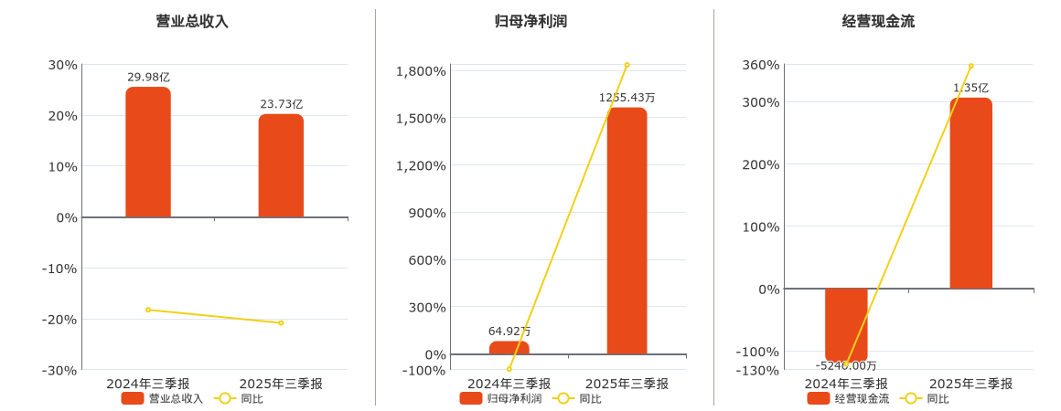 公司营业总收入为23.73亿元。归母净利润为1255.43万元,较去年同报告期归母净利润增加1838.89万元。经营活动现金净流入为1.35亿元,较去年同报告期经营活动现金净流入增加1.67亿元。