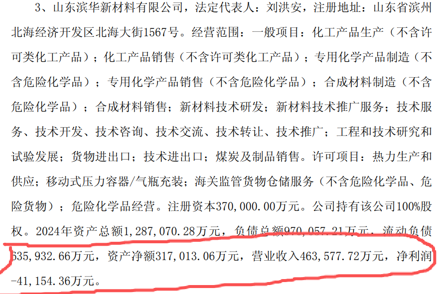 在股权融资不顺畅情况下,滨华新能源依靠负债推动项目建设,据滨化股份披露的2025年预计担保事项的公告,滨华新材料截至2024年底的资产负债率为75.38%。2024年,该公司营收为46.36亿元,净利润为-4.12亿元。截至2024年底,该公司总资产为128.71亿元,净资产为31.7亿元,其净资产已经低于37亿注册资本。