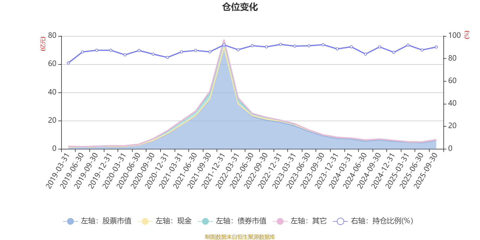 据定期报告数据统计,近三年平均股票仓位为89.67%,同类平均为72.14%。2022年末基金达到92.58%的最高仓位,2019年一季度末最低,为76.14%。